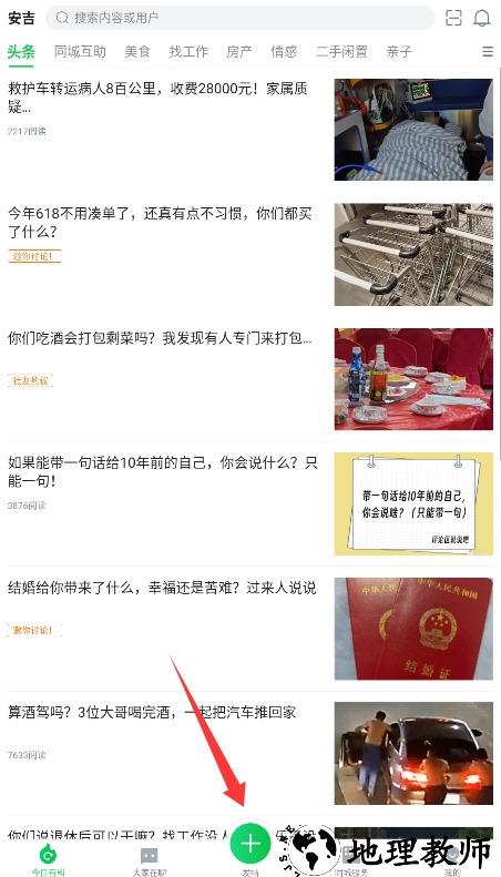 2、在首页底部点击中央的加号发帖功能,进入内容创作与发帖功能选择界面。