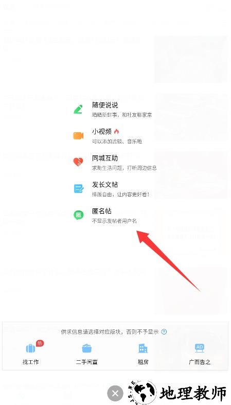 3、根据需求选择发帖类型,包括日常动态、视频分享、同城交流或长篇文章等格式。