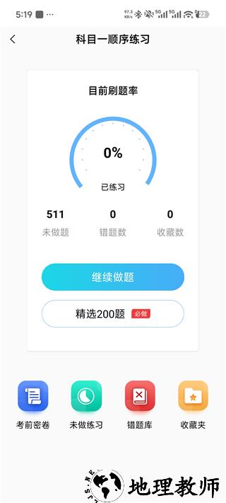 2、顺序练习:科目一练习时可查看刷题进度,可选择继续做题或精选 200 题必做,还能使用考前密卷和错题库,针对性提升薄弱环节。