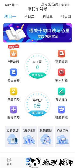 1、考试板块:打开摩托车驾考 App,点击考试板块,内有科目一至科目四学习入口,含 VIP 会员专享、精简做题等功能,还有辅助工具与模拟考试、错题收藏功能。