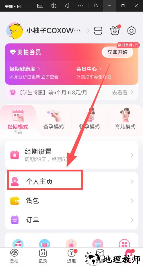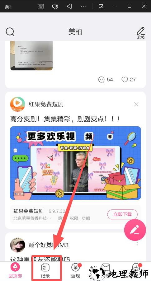 1、打开美柚APP,在界面底部的功能导航栏中,找到并点击"记录"选项;