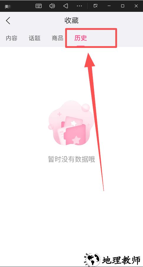 3、进入收藏页面后,点击右上角的"历史"选项;