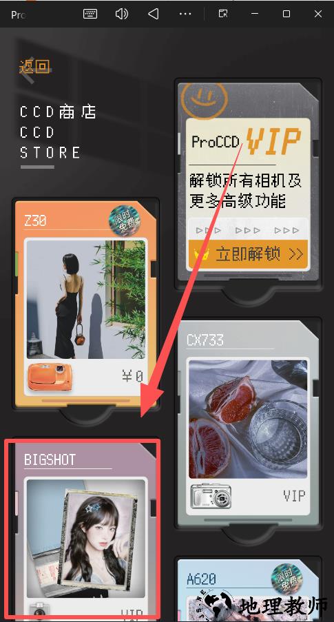 2、点击界面左侧的相机图标,进入相机功能菜单后,再点击商店图标。商店中提供多种相机胶卷和拍摄特效,用户可以根据需要浏览并选择感兴趣的内容。