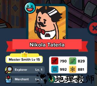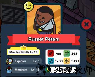 每个人物都有经验设置,打造武器、加工附魔、旅游锻炼都可以获得经验值,当当前级别满级的时候,就可以按照技能树升级到下一级别了,真正要赚钱,主要还是靠各种牛x的人物属性,加上家装设置才能打造出完美的武器,初始的4个工匠,除了Perters以外,其他的都比较渣,建议尽早更换。下面是一些主要属性比较牛x的人物介绍: