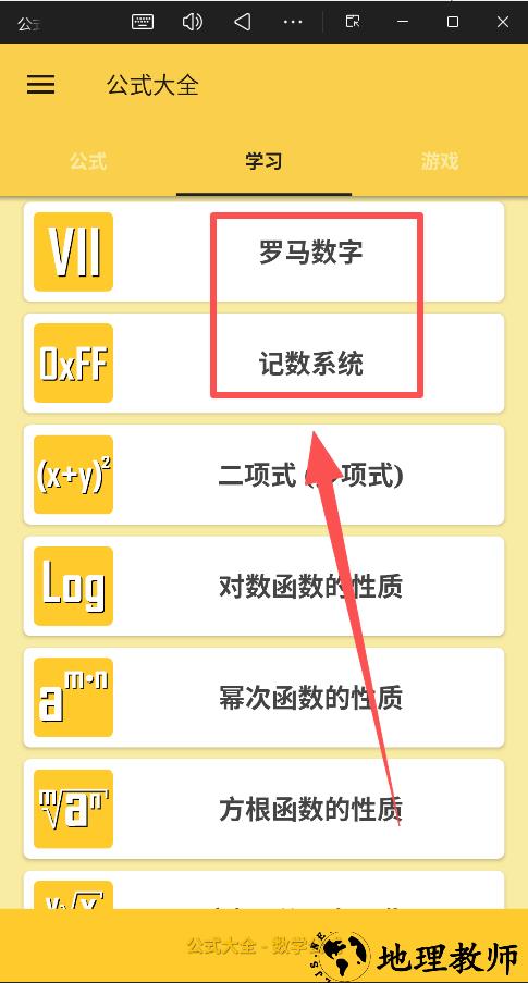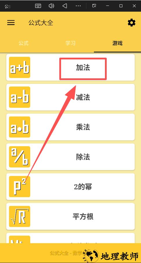 前往 游戏 选项卡,选择与你刚学习的公式相关的运算类别(例如,学习了一次方程,可以去练习基础的“加法”和“乘法”)。