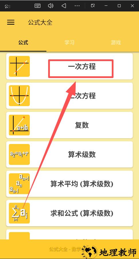 当你遇到一个不熟悉的数学概念(如“一次方程”)时,首先进入 公式 选项卡,找到并点击它,仔细阅读其定义和公式形式。