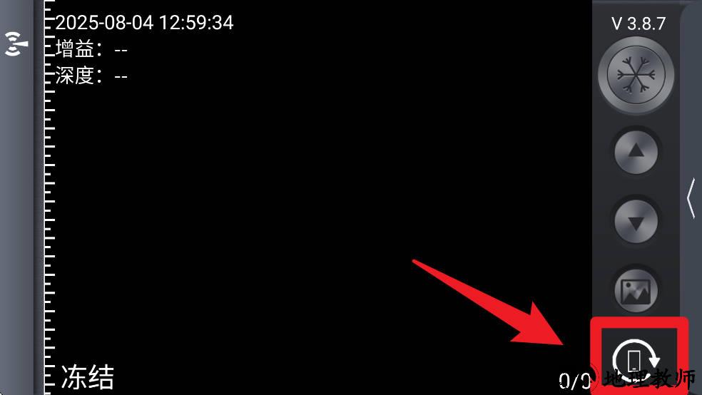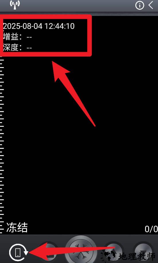 1、在进入APP后,屏幕左上角会显示当前时间、深度参数,若设备未连接或未启动探头,这些值将显示为--。