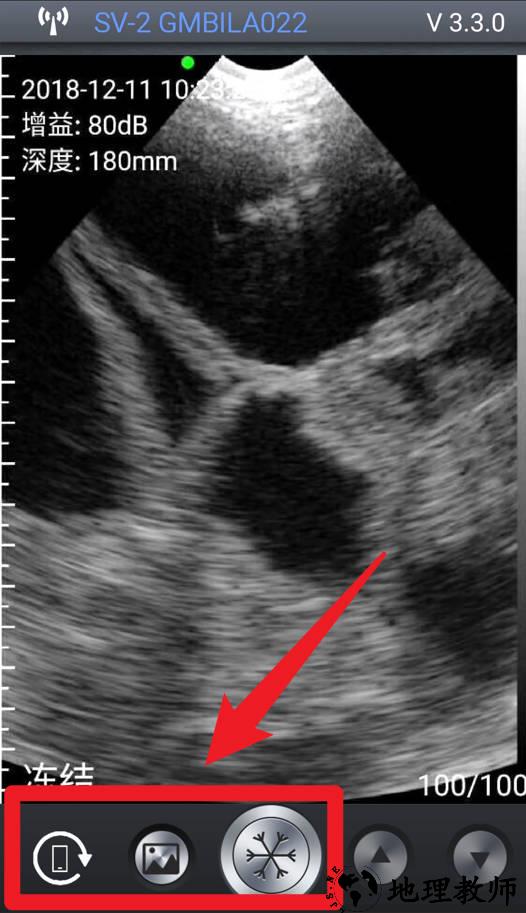 3、当探头正常工作且图像实时显示时,界面左上角会显示具体的增益,用户可据此调整图像清晰度与探测深度。