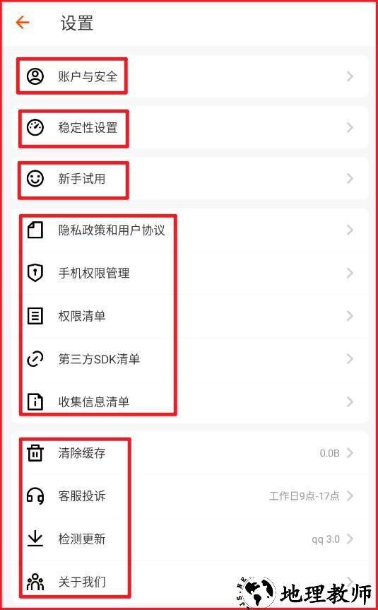 3、在设置页面中,提供账户与安全、稳定性设置、新手试用等功能,同时可查看隐私协议、权限管理、第三方SDK清单及收集信息清单等详细内容。