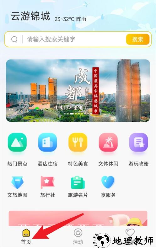1、首页展示成都热门景点、美食住宿与文旅服务,支持多类型场景一键进入使用。