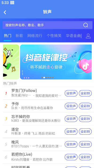 3、热门铃声一键设置:手机铃声、来电彩铃等,轻松一键完成设置;