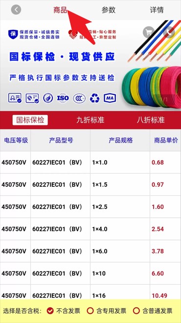 2、进入商品页可查看各规格型号的电缆单价信息,支持不同标准和含税类型的价格对比。
