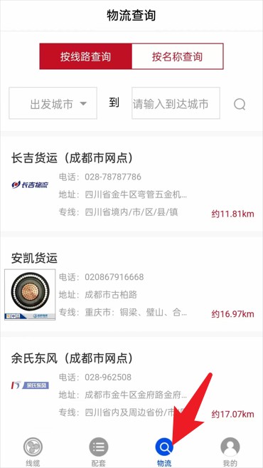 4、物流查询页面可按路线或网点名称查询货运公司,支持查看距离及联系信息,方便配送安排。
