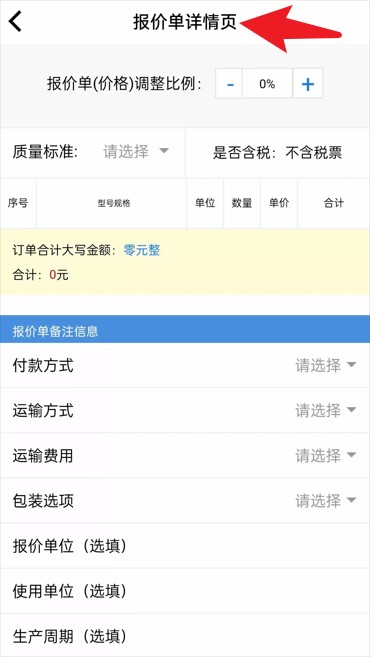 3、报价单详情页可根据需求自定义调整比例,填写运输包装等信息,自动生成总价数据。