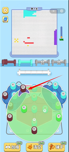 关卡分为上下两个区域。下方区域散落着各色毛线团,要点击对应颜色的操作按钮,拖动毛线缠绕到同色的柱子上。