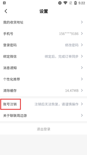 2、进入设置界面后,点击“注销账号”选项;