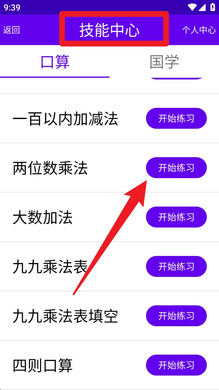 1. 在列表中找到两位数乘法项,点击右侧开始练习按钮进入练习页面。