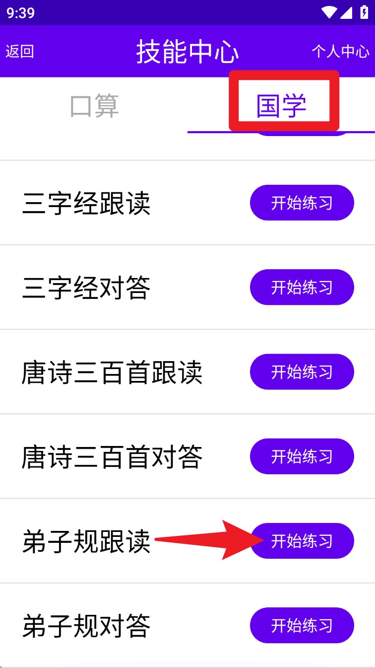3. 若想切换内容类别,点击顶部国学标签页,即可进入古诗词和经典朗读模块练习。