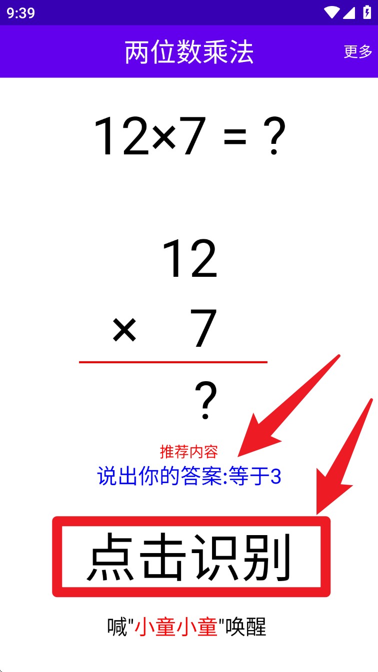 2. 页面中央会显示题目,用户可以直接说出答案或点击下方点击识别按钮进行语音识别。