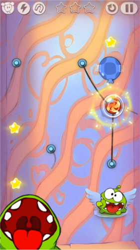 3、吹动葫芦,让小猪吃到最上方的星星,同时根据箭头指示,割断绳子。