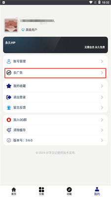 3、点击“我的”,找到去广告栏目并开启,后续使用过程将无广告干扰;