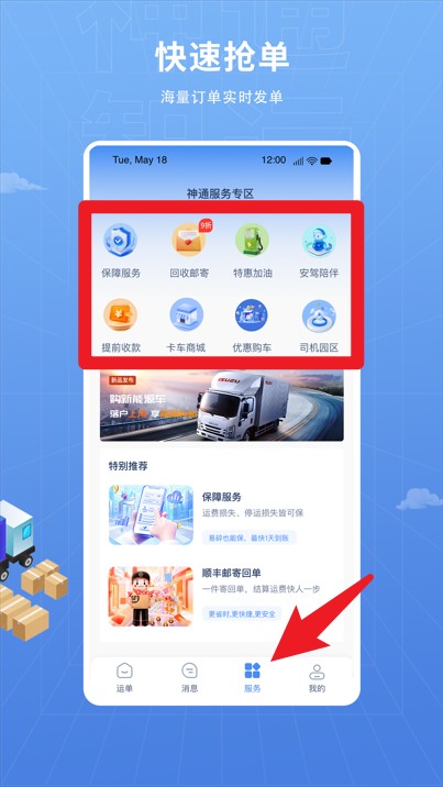 3.点击底部服务按钮进入服务专区,可选保险、油卡、回收货等多项实用功能。