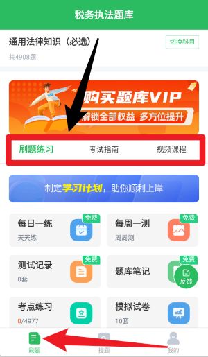 1、在刷题页面,可以点击考试指南等标签,快速切换至对应功能模块,进行系统刷题训练、了解考试内容方向。