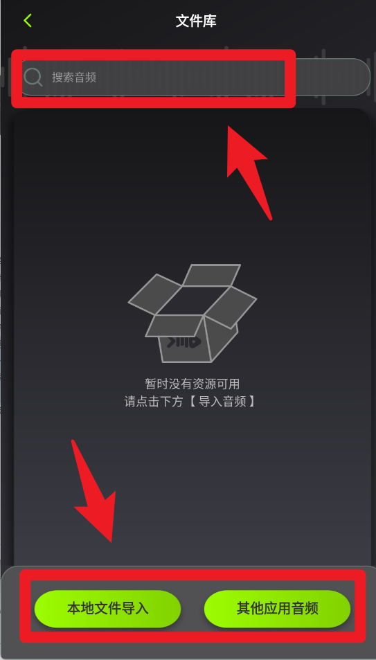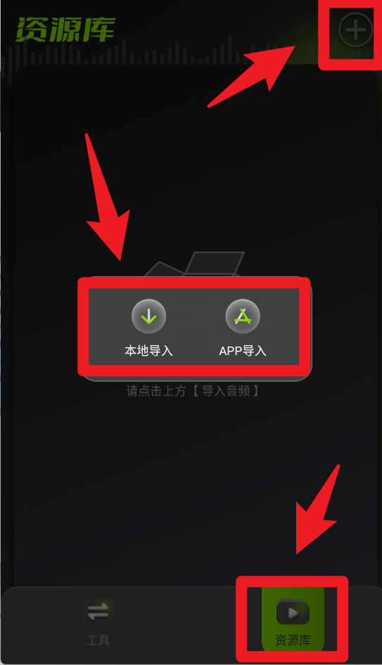 5、在资源库页面,点击右上角+按钮可选择本地导入或APP导入音频文件,方便后续进行编辑与使用。
