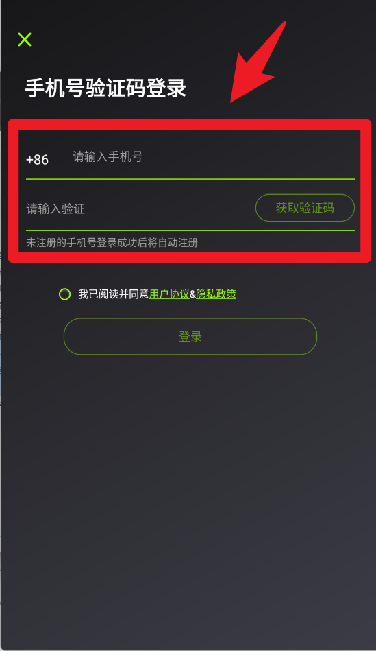 1、在登录界面输入手机号并获取验证码,勾选同意用户协议与隐私政策后点击登录即可进入软件。