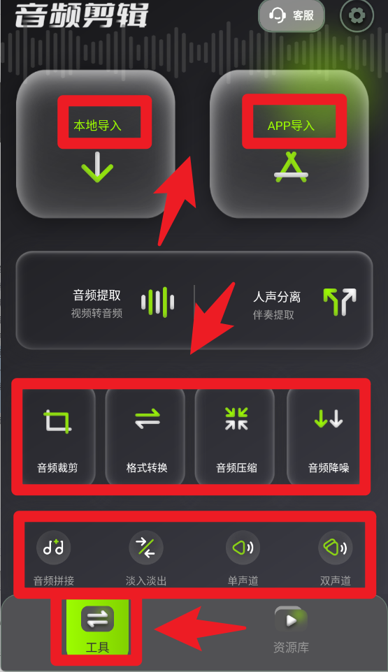 2、进入工具页面,可选择本地导入,并使用音频裁剪、格式转换、音频压缩、音频降噪等功能进行编辑。