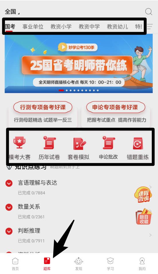 4、进入题库界面,可选择国考、事业单位、教师资格等科目,支持进行模拟大赛、历年试卷、套卷模拟、申论批改及错题重练功能。