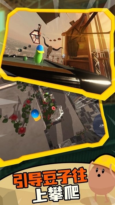 3. 角色背景故事:每个可操作角色均有专属剧情动画,如“机械豆子”是科学家用废旧零件制造的实验体,渴望通过攀爬证明自己并非“无用之物”;“火焰豆子”因意外获得火焰能力而被族群驱逐,试图用攀爬成绩换取认可。