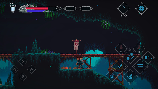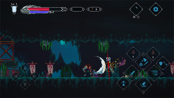 3、左屏控制移动,右屏完成跳跃、挥砍等操作,右上方可切换武器;