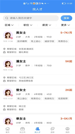 2. 操作便捷高效:首页设置“找工作”“找人才”“直聊”“我的”四大模块,用户可一键发布简历或职位,通过筛选地区、薪资、行业等条件快速定位目标岗位,投递响应时间缩短至30秒内。