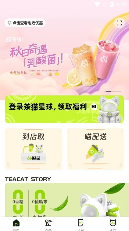1、进入茶猫Teacat APP主界面,完成账号登录即可开启点单服务。