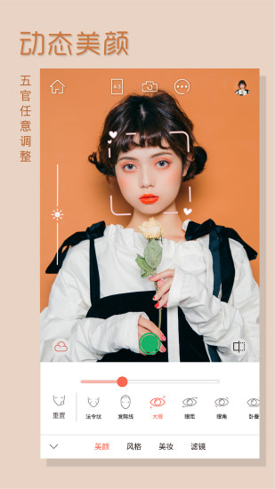 1、实时美颜:视频磨皮算什么美颜,要的是硬币眼、细高鼻、巴掌脸!十大实时动态美颜功能,细致调整五官,边拍边美,给你照镜子般的惊艳体验。