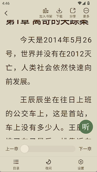 4、听书功能:提供语音朗读服务,可解放双眼,在做家务、通勤或休息时轻松“听”小说。