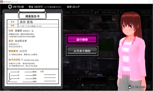 诱拐城镇冷狐版是一款融合商业模拟与角色扮演元素的日系风格手游。游戏中,玩家将扮演一名夜店老板,在经营夜店的同时,通过招募并培养年轻女孩,提升店铺吸引力,逐步扩展自己的商业帝国。游戏以高度自由的模拟养成玩法为核心,结合丰富的剧情和多线展开的故事情节,为玩家带来沉浸式的游戏体验。