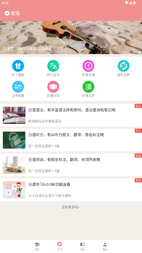 3.在发现页面,有五十音图、中日互翻、应急日语等