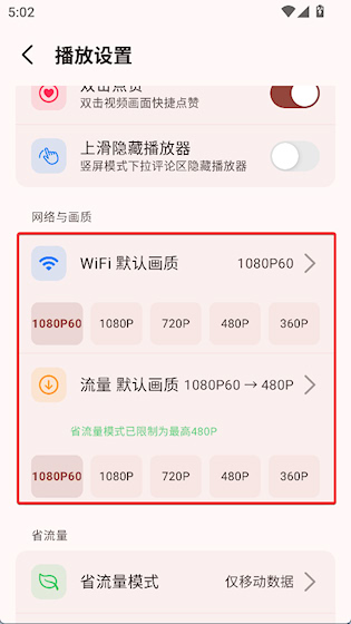 3、可以分别设置wifi和流量环境下的画质