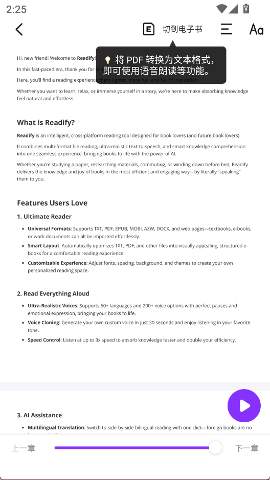 3、进入阅读界面可以一键转换为文本格式,然后使用语音朗读功能
