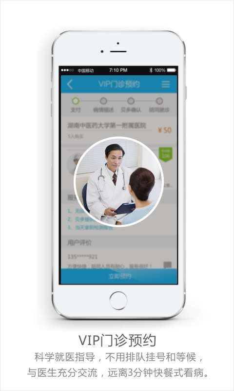 2、VIP门诊预约:快速预约、门诊直达,不用排队挂号和等候,与门诊医生充分交流,远离盲目就医和“3分钟快餐式看病”的危害;