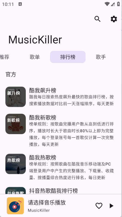 4、排行榜板块根据当前音乐热度排序,清晰呈现热门曲目,助力发现当下流行音乐。