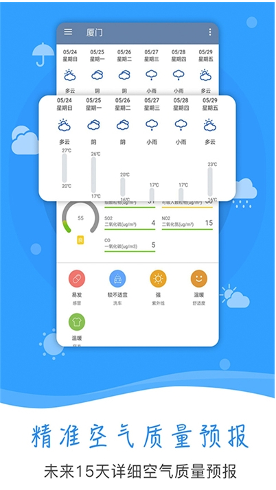 3. 空气质量监测:提供实时及未来多日的空气质量指数(aqi)和pm2.5数据,让用户了解空气状况,保护自己和家人的健康。