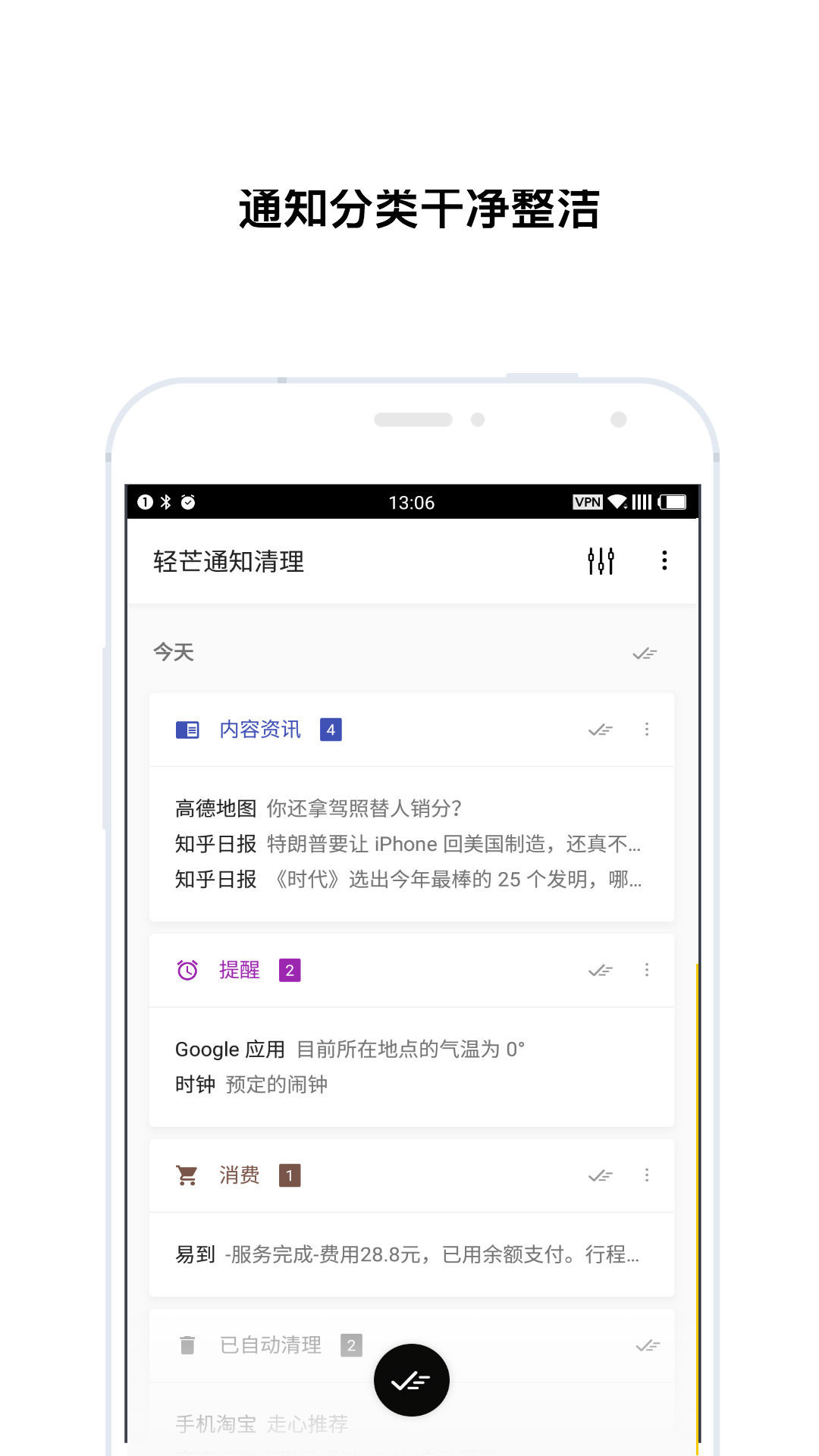 1. 智能分类:轻芒通知清理能够精准识别并分类手机上的各类通知,包括内容资讯、聊天、提醒、邮件等,帮助用户快速区分重要与不重要信息。