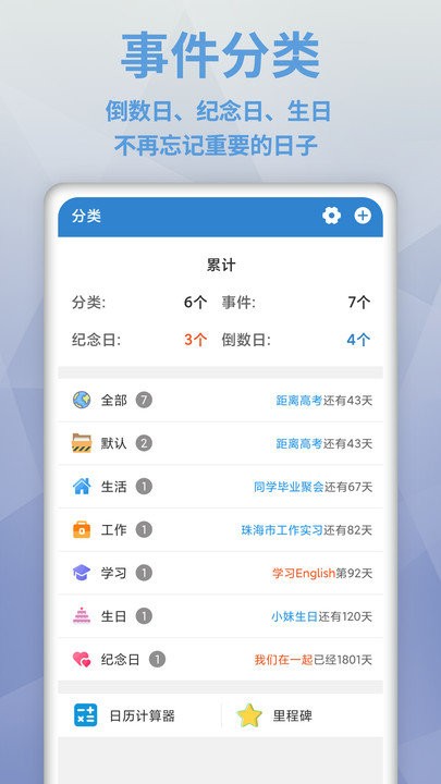3. 多种分类与自定义:提供纪念日、工作、生活三种默认分类,并支持用户自定义更多分类,满足不同用户的个性化需求。