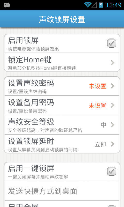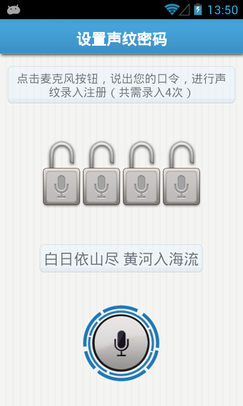 声纹锁屏是一款专为android系统设计的创新手机锁屏软件,它采用先进的声纹识别技术,通过识别用户的独特声音波形来实现手机的锁屏与解锁操作。用户只需简单设置,即可利用自己的声音作为密码,保护手机免受未授权访问,同时避免了传统密码可能带来的记忆负担和遗忘风险。