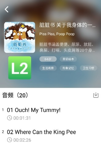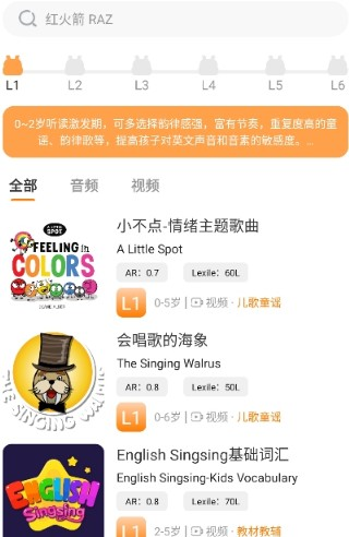 1、打开软件后可见分级阅读体系,平台将学习内容划分为L1到L6六个等级,可根据孩子英语水平挑选适配难度读物开启学习。