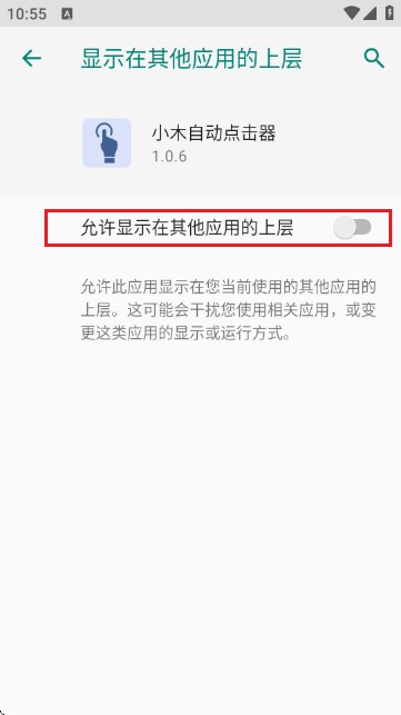 5、根据提示进入系统设置页面,找到“允许显示在其他应用的上层”选项,将其开关打开,完成悬浮窗权限授权,确保应用正常运行。