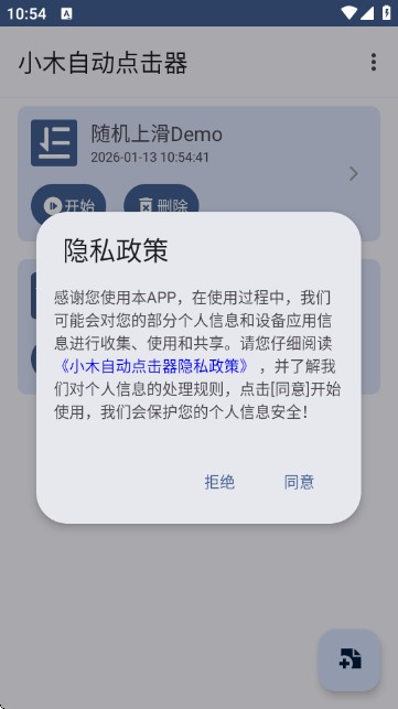1、打开“小木自动点击器”应用,系统会弹出隐私政策提示框,说明应用可能收集和使用个人信息及设备信息。仔细阅读《小木自动点击器隐私政策》后,选择“同意”即可继续使用,选择“拒绝”则无法进入应用。